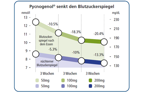 Pycnogenol® verzögert deutlich die Aufnahme von komplexen Zuckern wie Stärke. Es hemmt das Verdauungsenzym α-Glucosidase des Zwölffingerdarms sehr wirksam. Andere α-Glucosidase-Hemmer wie Extrakt aus grünem Tee, reines Catechin und das orale Diabetesmedikament Acarbose (Precose, Glucobay) sind deutlich weniger wirksam. Pycnogenol® verzögert die Aufnahme von Glucose aus einer Mahlzeit 190-mal wirksamer als verschreibungspflichtige Medikamente und verhindert so die typische hohe Blutzuckerspitze nach einer Mahlzeit.