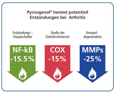 Es wurde gezeigt, dass die Anwendung von Pycnogenol® die Aktivierung des entzündungsfördernden „Hauptschalters“ NF-kB um 15,8 % senkt. Dieser „Hauptschalter“ kontrolliert die Mobilisierung aller entzündungsfördernden Moleküle, die bei Arthritis eine zerstörende Wirkung haben.