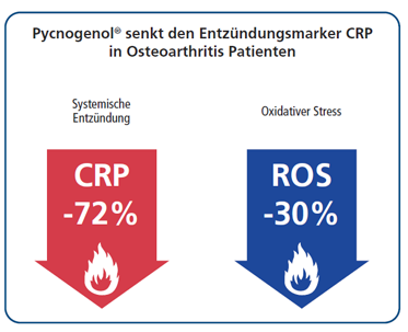 Es wurde ebenfalls gezeigt, dass Pycnogenol® den Entzündungsmarker C-reaktives Protein (CRP) signifikant um 72 % und reaktive Sauerstoffspezies (ROS) um 30 % senkt.