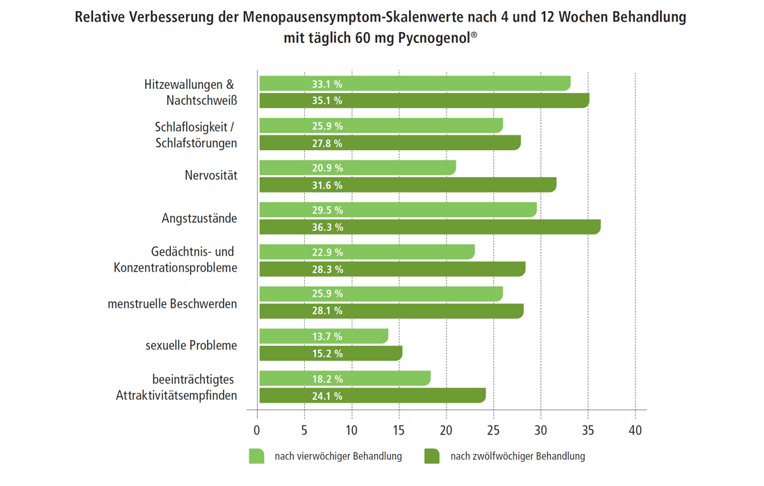 Der Pinienrindenextrakt Pycnogenol® wurde in zahlreichen kontrollierten Studien getestet und verbessert nachweislich alle Wechseljahresbeschwerden, einschließlich Hitzewallungen und nächtliches Schwitzen, Menstruationsbeschwerden, sexuelle Probleme, beeinträchtigtes Gefühl der Attraktivität, Gedächtnis- und Konzentrationsprobleme, Angstzustände, Nervosität, Schlafstörungen, Depression und andere. Es ist wichtig zu erwähnen, dass Pycnogenol® nachweislich keinen Einfluss auf den Hormonspiegel hat.