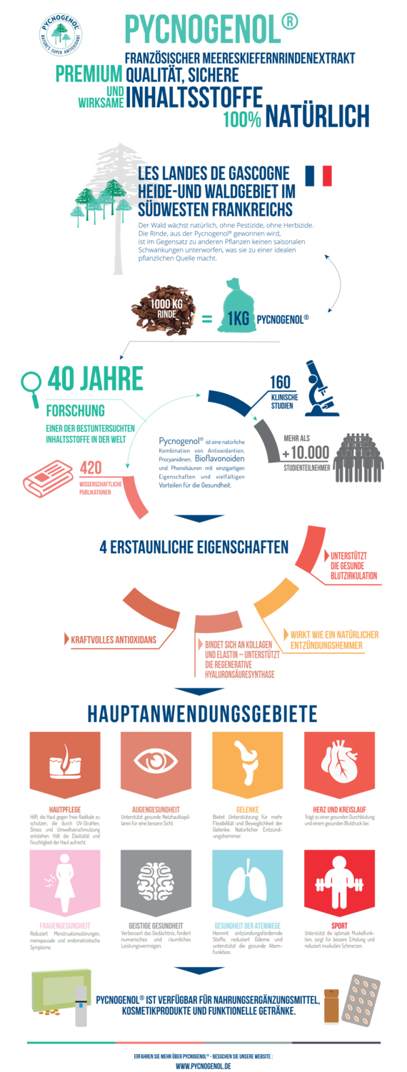 Pycnogenol® ist ein natürlicher Pflanzenextrakt aus der Rinde der französischen Meereskiefer, die entlang der südwestlichen Küste Frankreichs wächst. Er enthält eine einzigartige Kombination von Procyanidinen, Bioflavonoiden und organischen Säuren, die zahlreiche gesundheitliche Vorteile bietet. Die eingehende Erforschung des Extraktes in den vergangenen 40 Jahren hat 450 publizierte Studien- und Übersichtsartikel hervorgebracht, die seine Sicherheit und Effektivität dokumentieren. Heute ist Pycnogenol® in mehr als 1000 Nahrungsergänzungsmitteln, Multivitaminpräparaten und Gesundheitsprodukten weltweit enthalten.