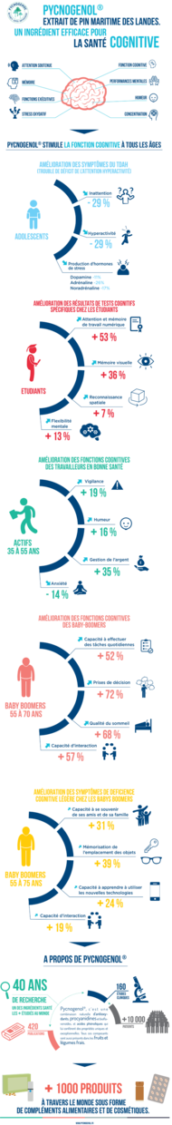 Nombreux sont ceux qui recherchent aujourd’hui des produits sains, naturels et efficaces. Des travaux de recherche ont montré que Pycnogenol® améliorait les fonctions cognitives. En effet, une séries d’épreuves informatisées a révélé une amélioration de la mémoire, du travail numérique et spatiale, lorsque les patients étaient sous Pycnogenol®