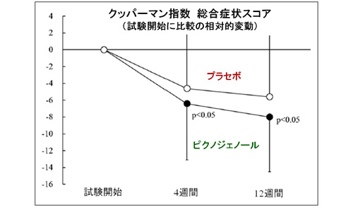 今回の試験では日本の更年期障害の研究で最も使われる調査指標である「クッパーマン指数」を採用した。ピクノジェノール®群またはプラセボ群の調査スコアを試験開始時または4週間と12週間で比較した結果、試験開始時にはピクノジェノール投与群とプラセボ投与群の間に有意差は無かったが、4週間目または12週目にもピクノジェノール®群の方が有意な改善効果が認められた。また心臓の動悸に対して、顕著な改善傾向が見られた(p=0.078)。