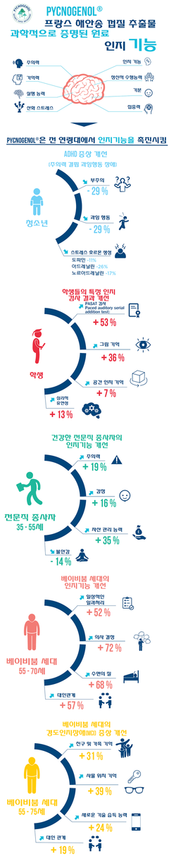 현대의 젊은 세대, 특히 학생들은 집중력 향상을 위해 천연 건강 기능식품을 찾고 있습니다. 피크노제놀®은 대학생들의 기억력과 시험 점수를 향상시키는 것으로 밝혀졌습니다. 이 새로운 임상시험에서 피크노제놀®은 정신적 능력을 향상하고 시험에 대한 불안을 최대 17%까지 감소시켰습니다.